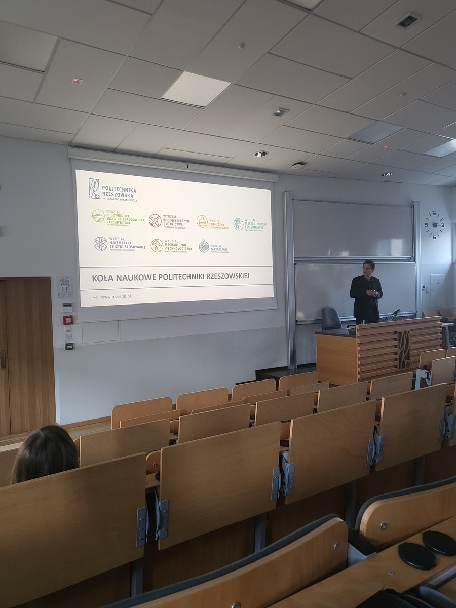 Popołudniowa część seminarium została poświęcona prezentacji działalności kół naukowych, w tym omówieniu ich inicjatyw, osiągnięć oraz wyzwań poznawczych i projektowych podejmowanych przez studentów. W ramach wstępu dr inż. Bartosz Pawłowicz, opiekun kół naukowych na Politechnice Rzeszowskiej, przedstawił charakterystykę aktywności młodych naukowców, wprowadzając uczestników w ogólną tematykę ich działalności badawczej. Następnie studenci pochwalili się swoimi doświadczeniami: