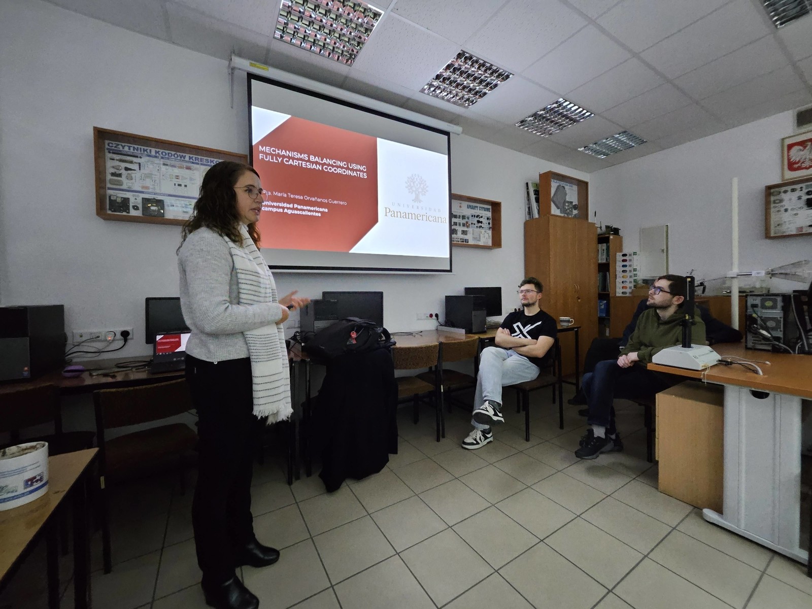 W trakcie seminarium naukowego Dr Maria Teresa podzieliła się z nami ogólnymi informacjami na temat macierzystego uniwersytetu oraz prowadzonych przez siebie badań. W trakcie seminarium naukowego wysłuchaliśmy wykładu pn. "Mechanisms balancing using fully Cartesian coordinates", podczas którego Pani Doktor omówiła autorski model matematyczny opisany z wykorzystaniem wyłącznie współrzędnych kartezjańskich. Jego istotę stanowią równania, za pomocą których definiowana jest równowaga mechanizmu (np. robota lub kamery) wyposażonego w przeciwwagę, poddawanego dynamicznym zmianom położenia. Badania Pani Doktor mają istotne znacznie dla zmniejszenia sił oddziaływających na maszynę i jej podłoże, na zmniejszenie hałasu i zmęczeniowe zużycie materiałów.
