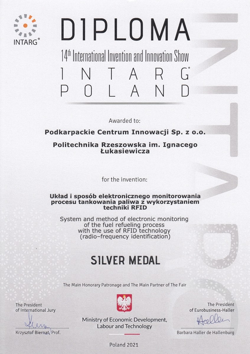 Najnowszy wynalazek pn. „Układ i sposób elektronicznego monitorowania procesu tankowania paliwa z wykorzystaniem techniki RFID” autorstwa dra hab. inż. Piotra Jankowskiego-Mihułowicza, prof. PRz, dra inż. Mariusza Węglarskiego, prof. PRz, mgra inż. Patryka Pyta i mgra inż. Mateusza Chamery – otrzymał Srebrny Medal podczas XIV Międzynarodowych Targów Wynalazków i Innowacji INTARG® 2021. Odbywające się w dniach 15-16 czerwca Targi INTARG® 2021 były kolejną okazją do spotkania przedstawicieli świata nauki, przemysłu i biznesu. Jednym z wydarzeń towarzyszących był konkurs pn. „Giełda TOP wynalazków”, w ramach którego zgłoszone innowacje zostały poddane ocenie przez międzynarodowe jury. Nagrodzony wynalazek zespołu z Katedry Systemów Elektronicznych i Telekomunikacyjnych (KSEiT) na Wydziale Elektrotechniki i Informatyki (WEiI) Politechniki Rzeszowskiej (PRz), stanowi efekt zgłoszenia patentowego nr P.435993, które powstało w wyniku realizacji projektu badawczego współfinansowanego z Europejskiego Funduszu Rozwoju Regionalnego, w ramach Osi Priorytetowej nr I „Konkurencja i innowacyjna gospodarka” z Regionalnego Programu Operacyjnego Województwa Podkarpackiego na lata 2014-2020 (okres realizacji: 03.01–30.06.2020 r.). Zgłoszenie do konkursu zostało zrealizowane z inicjatywy Podkarpackiego Centrum Innowacji.