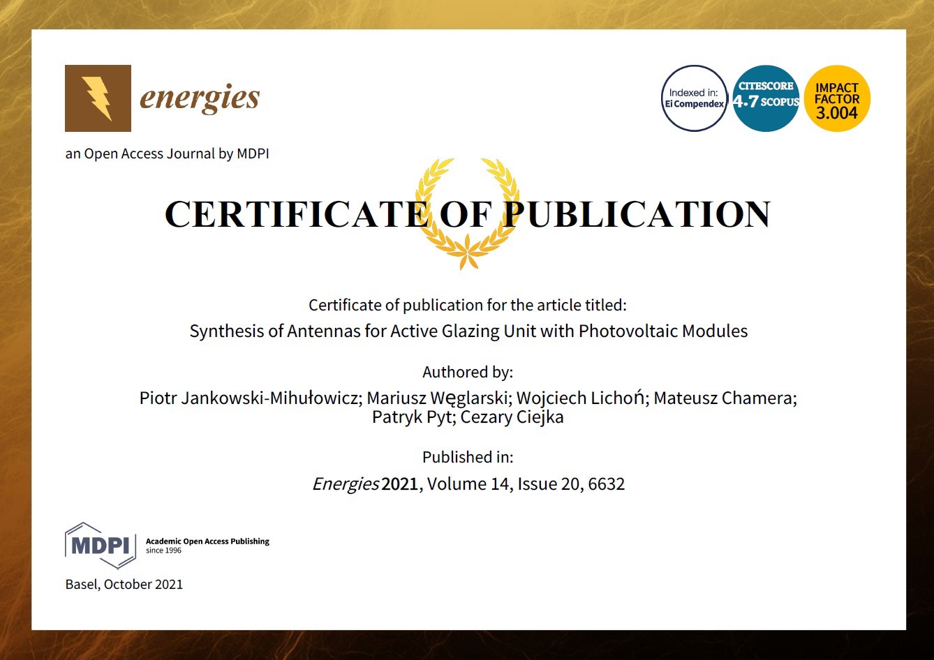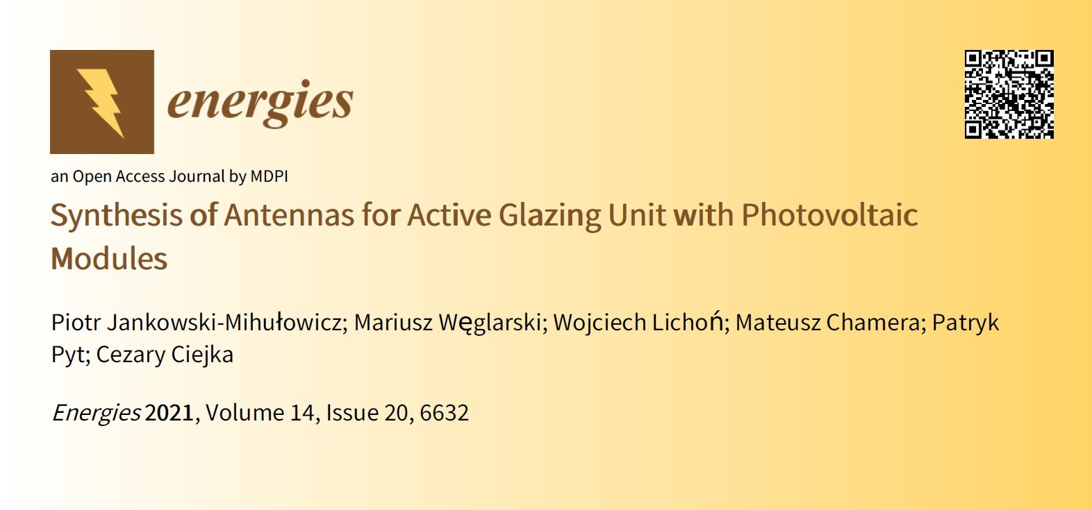 Jankowski-Mihułowicz P., Węglarski M., Lichoń W., Chamera M., Pyt P., Ciejka C.: Synthesis of antennas for active glazing unit with photovoltaic modules, Energies, ISSN: 1996-1073, Vol. 14, No. 20, 6632, 2021 (DOI: 10.3390/en14206632).