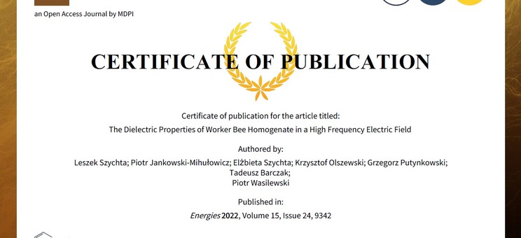 Szychta L., Jankowski-Mihułowicz P., Szychta E., Olszewski K., Putynkowski G., Barczak T., Wasilewski P.: The Dielectric Properties of Worker Bee Homogenate in a High Frequency Electric Field, Energies, Vol. 15, No. 24, 9342, 2022 (DOI: 10.3390/en15249342).