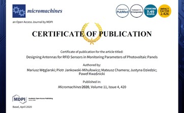 W dniu 17 kwietnia 2020 r. ukazała się nowa publikacja: Węglarski M., Jankowski-Mihułowicz P., Chamera M., Dziedzic J., Kwaśnicki P.: Designing Antennas for RFID Sensors (...)