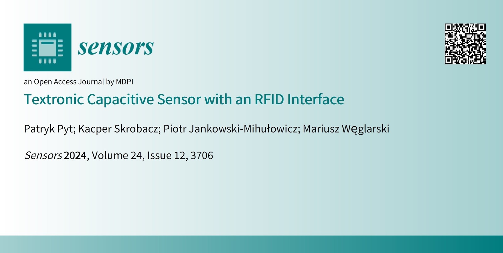 Pyt P., Skrobacz K., Jankowski-Mihułowicz P., Węglarski M.: Textronic Capacitive Sensor with an RFID Interface, Sensors, Vol. 24, No. 12, 3706, 2024 (DOI: 10.3390/s24123706).