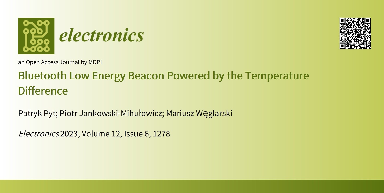 Pyt P., Jankowski-Mihułowicz P., Węglarski M.: Bluetooth Low Energy Beacon Powered by the Temperature Difference, Electronics, Vol. 12, No. 6, 1278, 2023 (10.3390/electronics12061278).