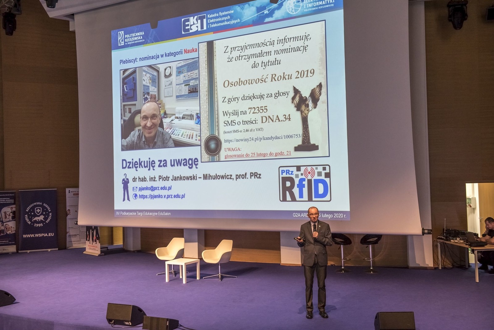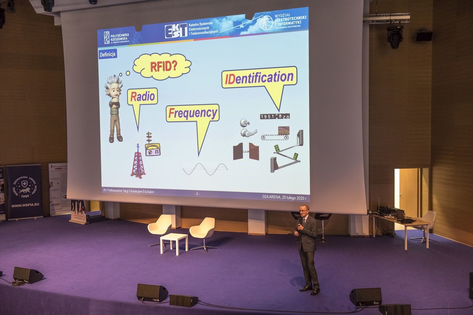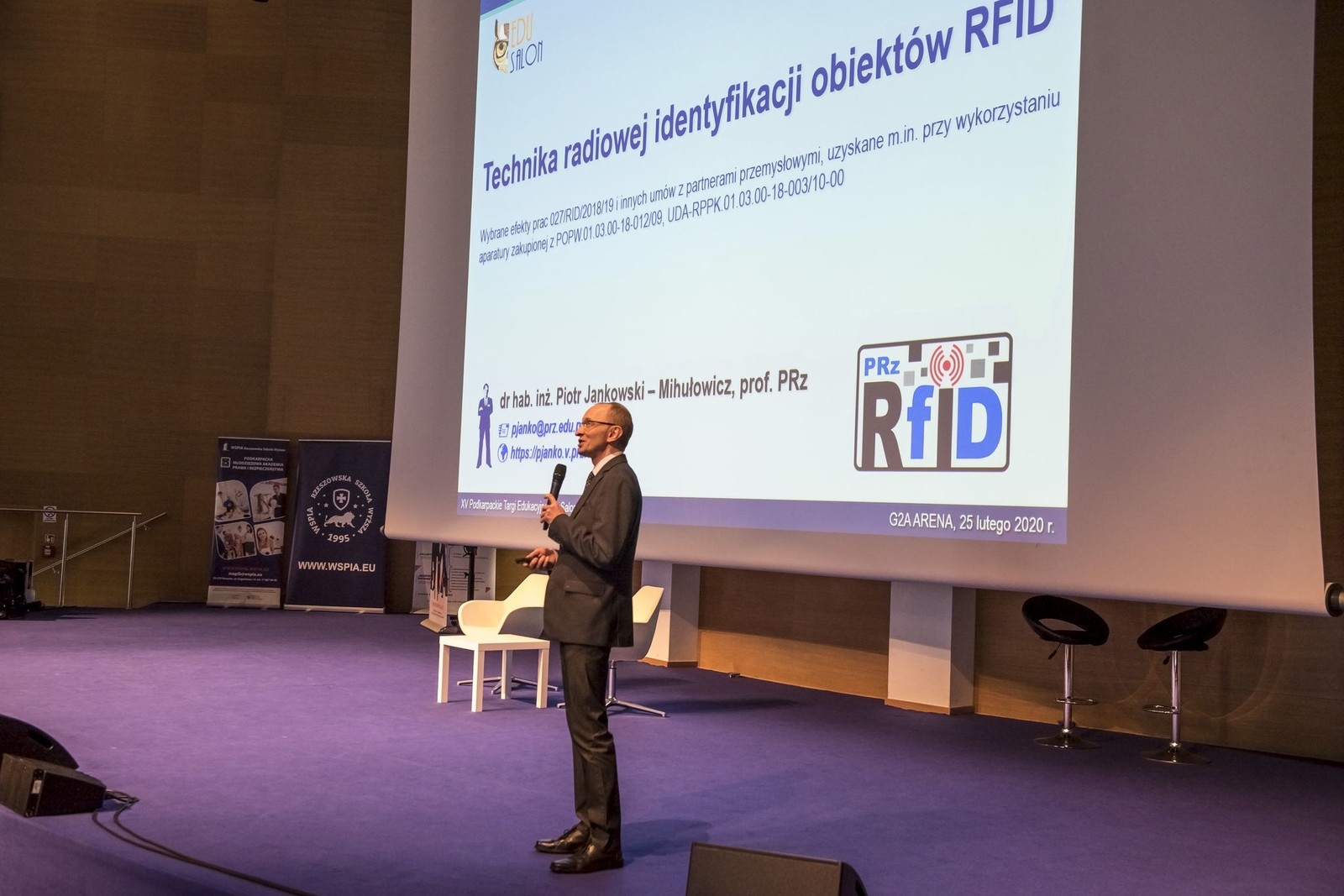 25 lutego 2020 r. dr hab. inż. Piotr Jankowski-Mihułowicz, prof. PRz miał przyjemność poprowadzić lekcję zupełnie inną niż zwykle na temat techniki radiowej identyfikacji obiektów RFID. Lekcja ta odbyła się w ramach warsztatów dla uczniów, jakie zostały zorganizowane podczas XV edycji Podkarpackich Targów Edukacyjnych EduSalon w Centrum Wystawienniczo-Kongresowym Województwa Podkarpackiego G2A ARENA w Jasionce. Podczas wykładu w sposób wyjątkowo obrazowy zostały omówione wybrane wynalazki, a także praktyczne efekty prac badawczo-rozwojowo-wdrożeniowych, jakie na przestrzeni ostatnich lat zrealizowano w Zespole Katedry Systemów Elektronicznych i Telekomunikacyjnych, między innymi w ramach projektu 027/RID/2018/19 i innych umów z partnerami przemysłowymi. W ten sposób wyjaśniono słuchaczom to, czym jest technika RFID i jakie jest jej praktyczne zastosowanie oraz przyszłość w otaczającym świecie.