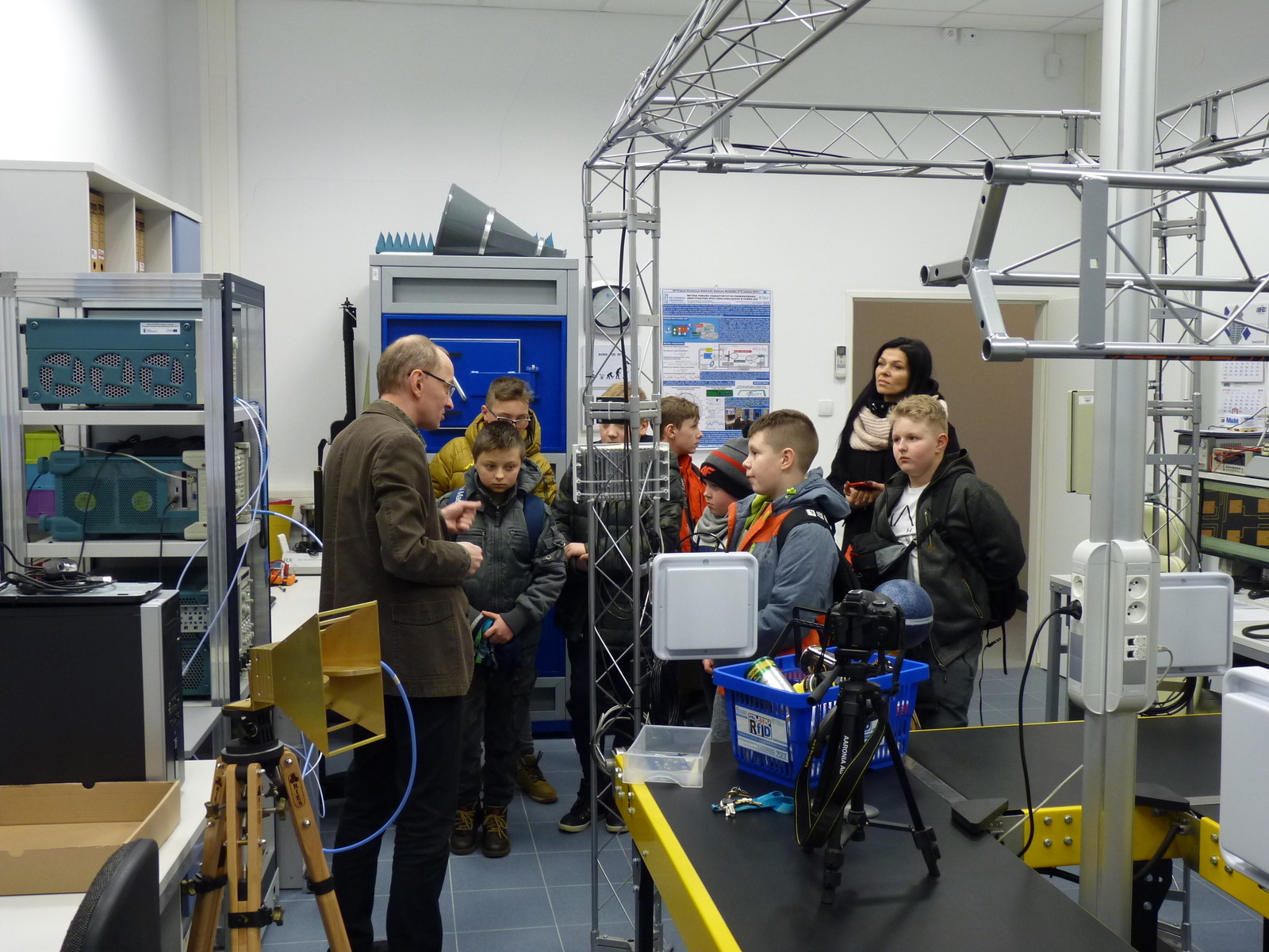 W dalszym etapie wycieczki zwiedzający zawędrowali do specjalistycznego laboratorium techniki radiowej identyfikacji obiektów (RFID – ang. Radio Frequency IDentification), gdzie dr hab. inż. Piotr Jankowski-Mihułowicz, prof. PRz z podobną pasją i zaangażowaniem zaprezentował świat anten i niewidocznych fal radiowych, bez których nawet nasi mali goście nie wyobrażają sobie funkcjonowania wielu urządzeń powszechnego użytku. Prof. Jankowski-Mihułowicz wpierw opowiedział o tym, czym są identyfikatory radiowe i gdzie je można spotkać w codziennym życiu. Następnie na przykładzie elektronicznego koszyka RFID zaprezentował to, jak wygodnie i sprawnie w przyszłości będzie można realizować zakupy w sklepach samoobsługowych, gdzie już nie trzeba będzie wyjmować produktów przy kasie. W dalszej części tej radiowej podróży nasi mili goście mogli zobaczyć obszar najnowszych osiągnięć badawczych, które dotyczą układów tekstronicznych (np. ubrań połączonych z identyfikatorami radiowymi). Przy tej okazji uśmiech na twarzach zwiedzających (szczególnie pedagogów) wywołał fakt, że w przyszłości np. pralka sama dobierze odpowiedni program do zawartości wrzucanej do niej odzieży, a żelazko zaprogramuje się tak, żeby nie zniszczyć prasowanych ubrań.