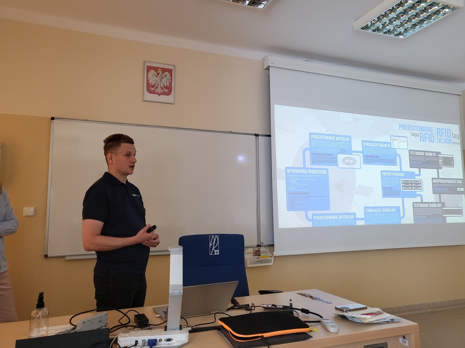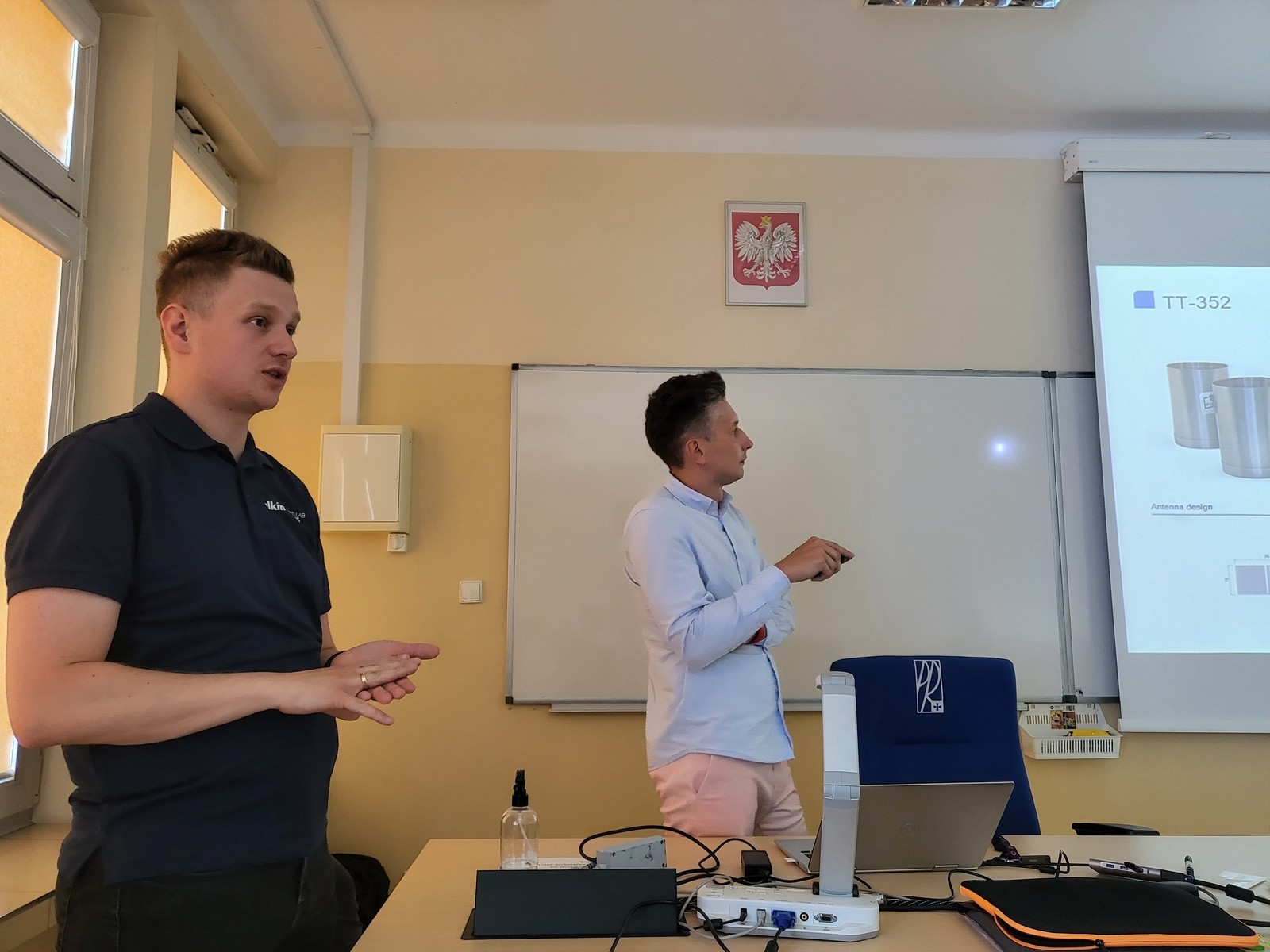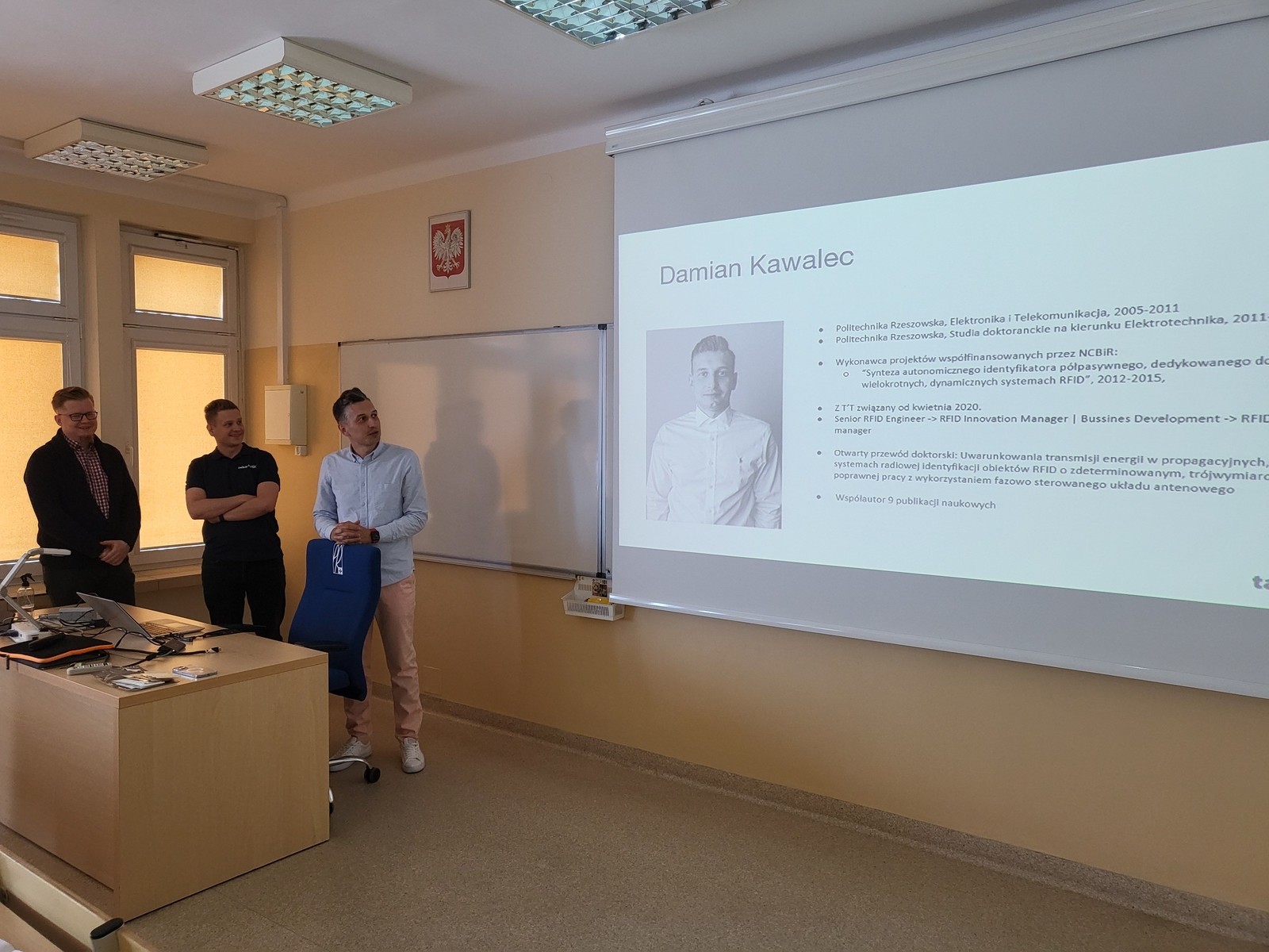 W dniu 6 czerwca 2023 roku studenci ostatniego semestru studiów II stopnia na kierunku elektronika i telekomunikacja, w ramach kończących się zajęć z modułu pn. technika radiowej identyfikacji obiektów, mieli okazję do spotkania się z przedstawicielami firmy Talkin’ Things, które zostało zorganizowane z inicjatywy dra hab. inż. Piotra Jankowskiego-Mihułowicza, prof. PRz. W trakcie spotkania odbył się wykład, podczas którego mgr inż. Wojciech Lichoń (Head of R&D), mgr inż. Damian Kawalec (RFID Expert/Sales Manager) oraz mgr inż. Mateusz Chamera (Lead of RFID Tag Development) wpierw zaprezentowali studentom Wydziału Elektrotechniki i Informatyki swoje sylwetki zawodowe, a następnie przedstawili projektowo-produkcyjny profil działalności firmy w zakresie techniki RFID. Podczas prezentacji omawiane były konkretne przykłady projektowania, prototypowania i produkcji w Talkin’ Things identyfikatorów RFID, które znajdują powszechne zastosowania w zautomatyzowanych procesach takich firm, jak np.: Decathlon, Inditex, Boehringer Ingelheim, Sato, Nestle, Calzedonia, L'Oréal, Sanofi, Mango, Goodwill, Mars, Coca-Cola, GSK, P&G, TAKARA-TOMY Company. Było to doskonałe uzupełnienie wiedzy, jaką studenci zdobywali podczas realizowanych zajęć dydaktycznych w przedmiotowym zakresie.