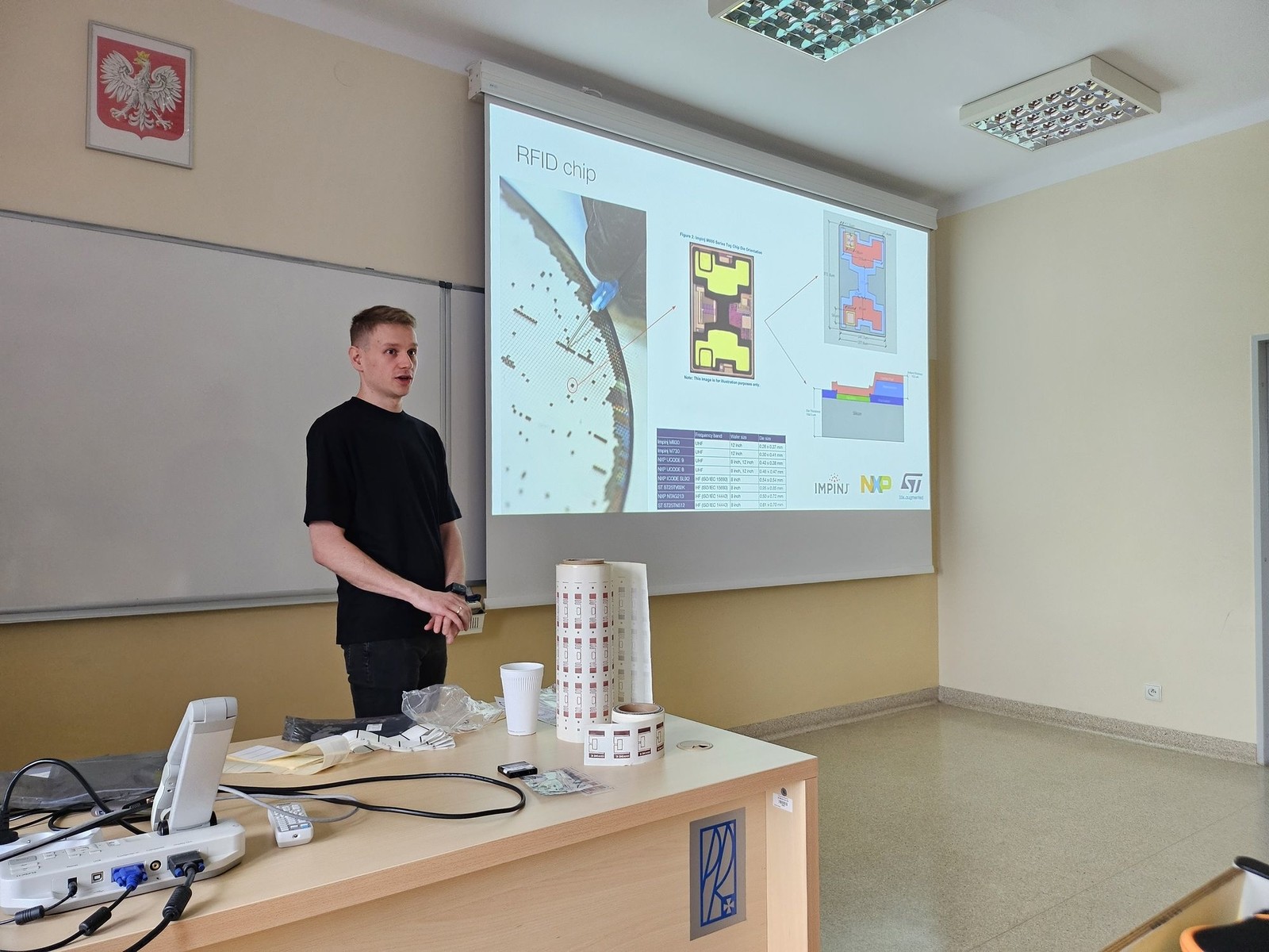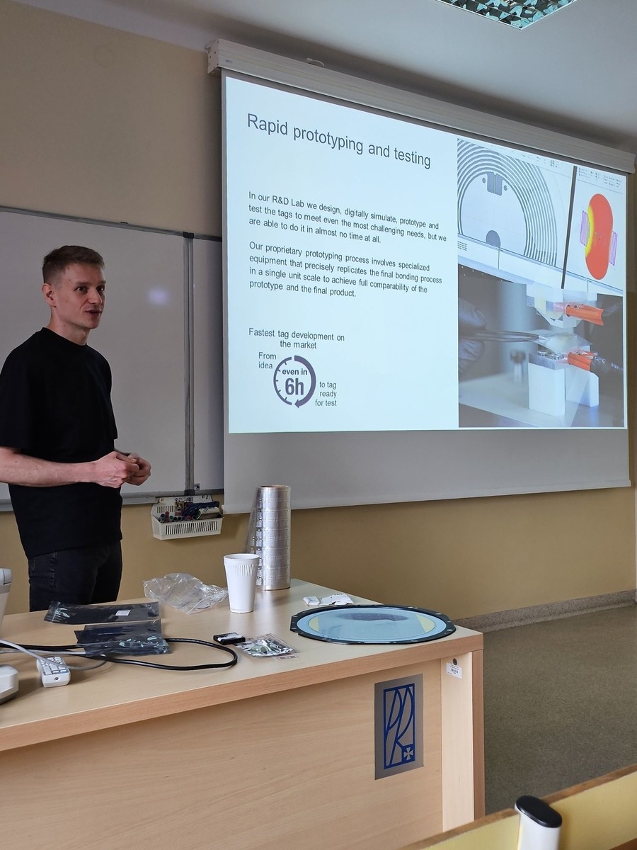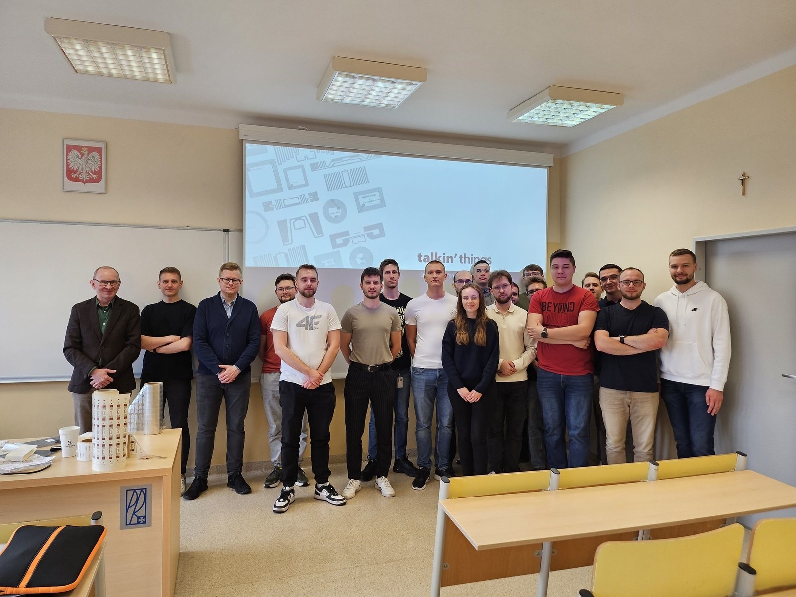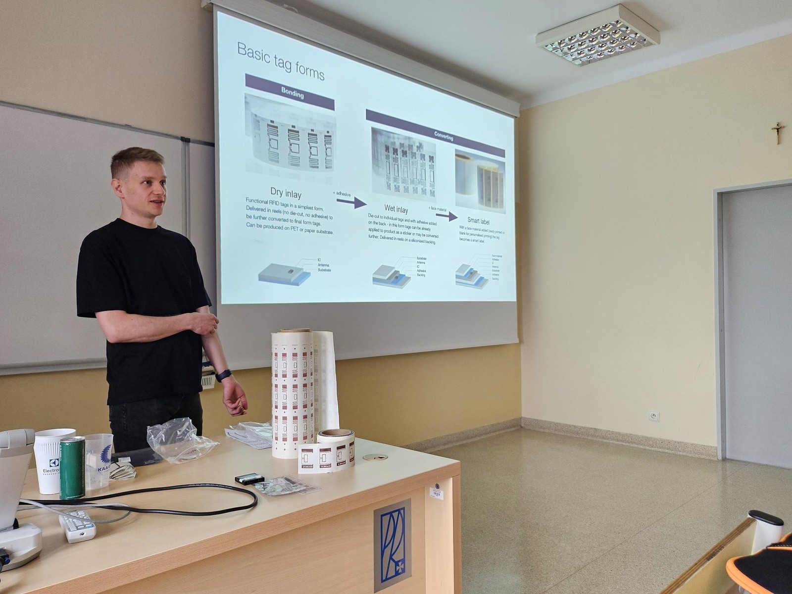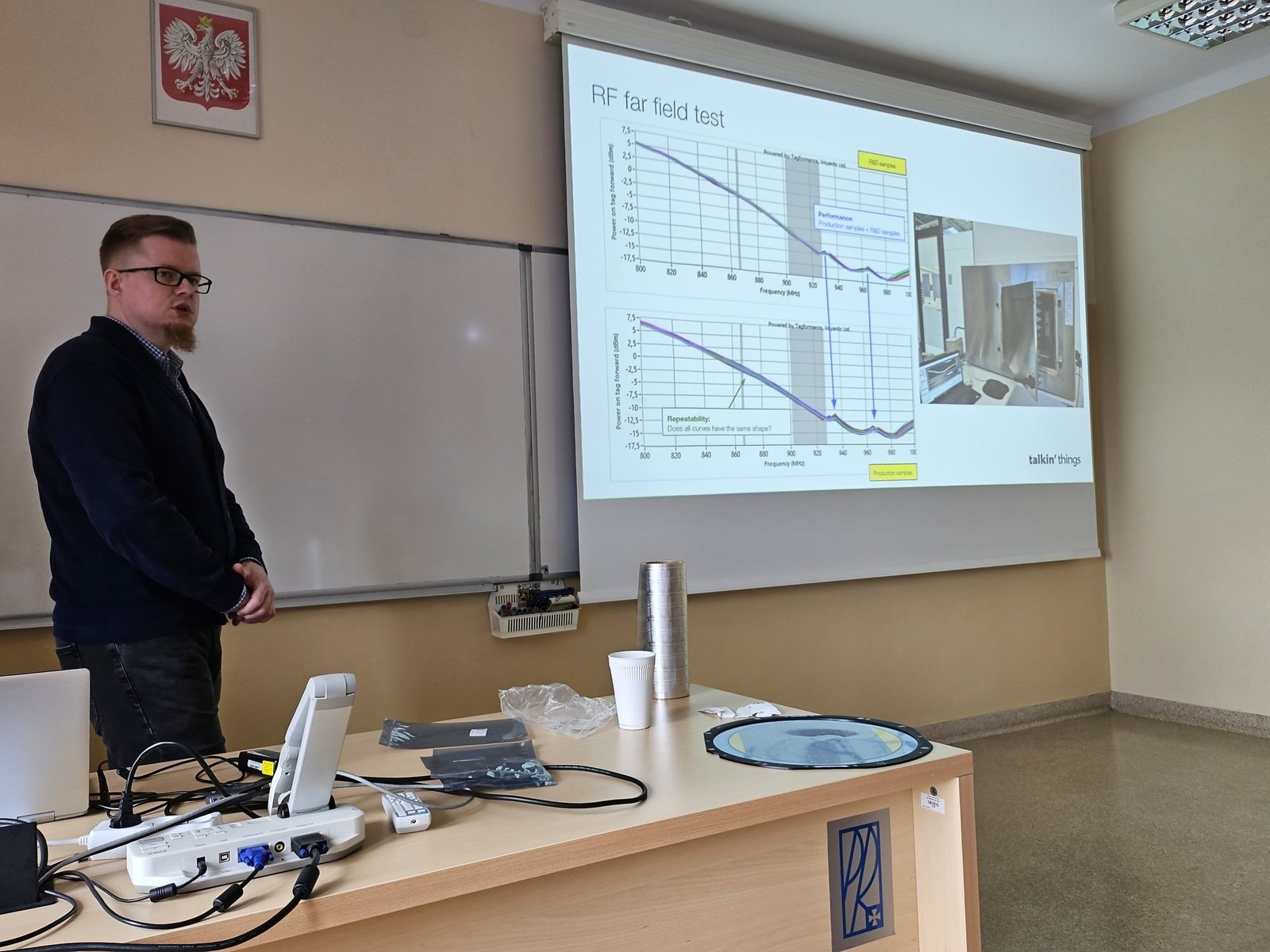 W dniu 3 czerwca 2025 roku studenci ostatniego semestru studiów II stopnia na kierunku elektronika i telekomunikacja, w ramach kończących się zajęć z modułu pn. technika radiowej identyfikacji obiektów, mieli okazję do spotkania się z przedstawicielami Talkin Things SA, które zostało zorganizowane z inicjatywy dra hab. inż. Piotra Jankowskiego-Mihułowicza, prof. PRz w ramach Politechnicznej Sieci VIA CARPATIA. W trakcie spotkania odbył się wykład, podczas którego mgr inż. Wojciech Lichoń (R&D Director) oraz mgr inż. Mateusz Chamera (Lead of RFID Tag Development) wpierw zaprezentowali studentom Wydziału Elektrotechniki i Informatyki swoje sylwetki zawodowe, a następnie przedstawili projektowo-produkcyjny profil działalności firmy w zakresie techniki RFID. Podczas prezentacji omawiane były konkretne przykłady projektowania, prototypowania i produkcji w Talkin Things identyfikatorów RFID, które znajdują powszechne zastosowania w zautomatyzowanych procesach takich firm, jak np.: Decathlon, Inditex, Boehringer Ingelheim, Sato, Nestle, Calzedonia, L'Oréal, Sanofi, Mango, Goodwill, Mars, Coca-Cola, GSK, P&G, TAKARA-TOMY Company. Prezentacja była wzbogacona pokazami półfabrykatów projektowanych anten, wafli krzemowych z chipami wykorzystywanymi w procesie produkcji, a także finalnych rozwiązań konstrukcyjnych identyfikatorów RFID. Było to doskonałe uzupełnienie wiedzy, jaką studenci zdobywali podczas zajęć dydaktycznych realizowanych w przedmiotowym zakresie.