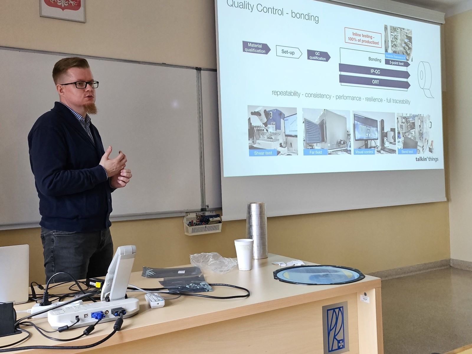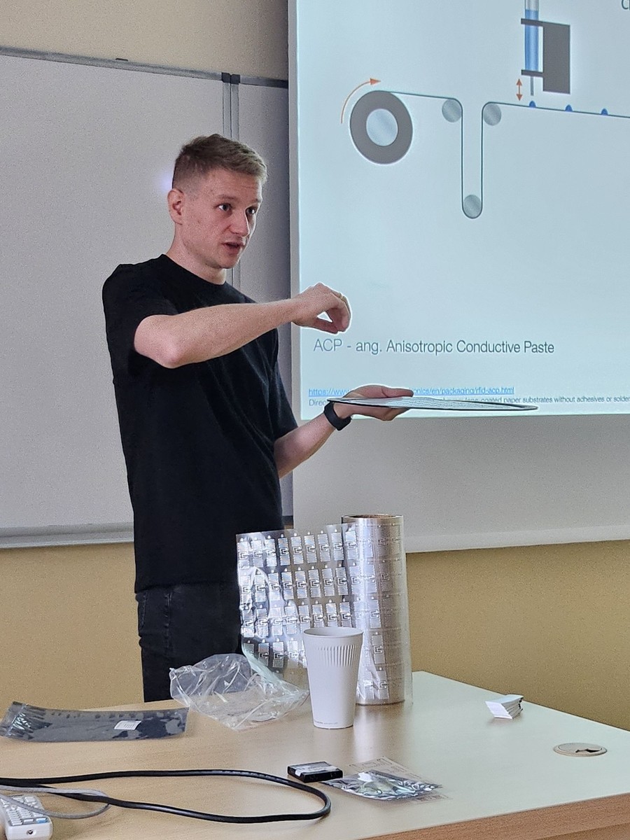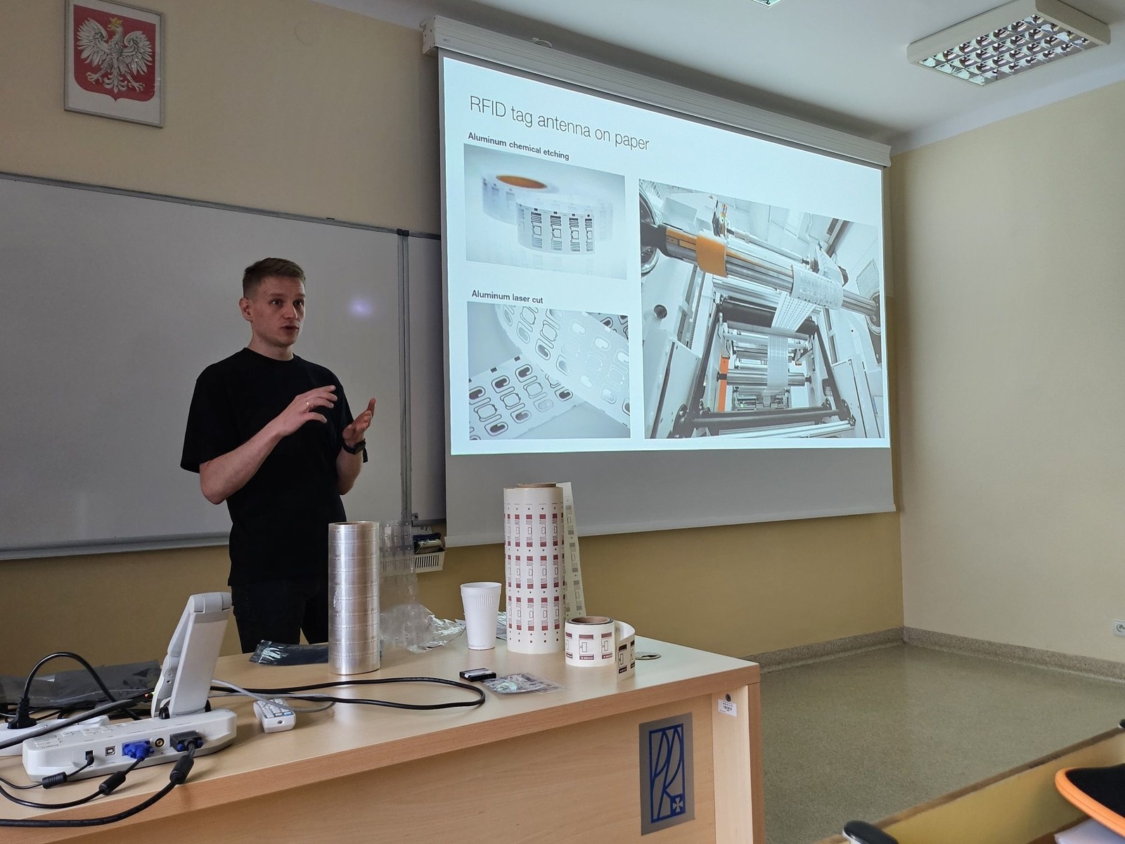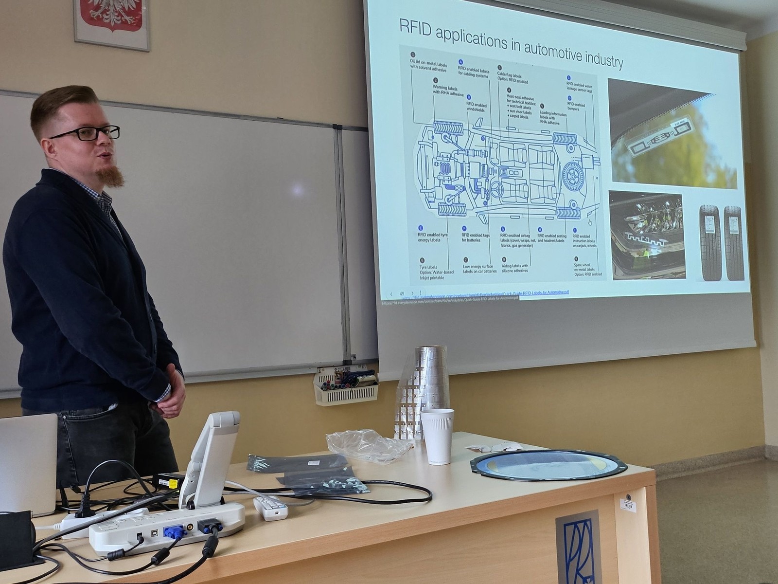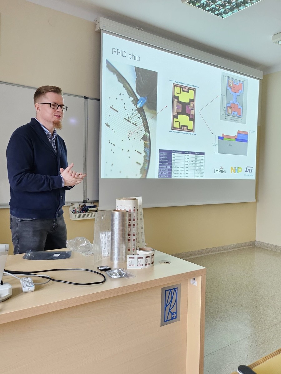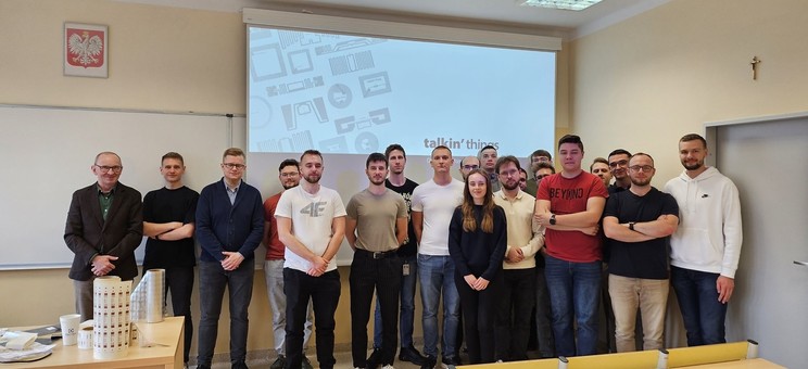 W dniu 3 czerwca 2025 roku studenci ostatniego semestru studiów II stopnia na kierunku elektronika i telekomunikacja, w ramach kończących się zajęć z modułu pn. technika radiowej identyfikacji obiektów, mieli okazję do spotkania się z przedstawicielami Talkin Things SA, które zostało zorganizowane z inicjatywy dra hab. inż. Piotra Jankowskiego-Mihułowicza, prof. PRz w ramach Politechnicznej Sieci VIA CARPATIA. W trakcie spotkania odbył się wykład, podczas którego mgr inż. Wojciech Lichoń (R&D Director) oraz mgr inż. Mateusz Chamera (Lead of RFID Tag Development) wpierw zaprezentowali studentom Wydziału Elektrotechniki i Informatyki swoje sylwetki zawodowe, a następnie przedstawili projektowo-produkcyjny profil działalności firmy w zakresie techniki RFID. Podczas prezentacji omawiane były konkretne przykłady projektowania, prototypowania i produkcji w Talkin Things identyfikatorów RFID, które znajdują powszechne zastosowania w zautomatyzowanych procesach takich firm, jak np.: Decathlon, Inditex, Boehringer Ingelheim, Sato, Nestle, Calzedonia, L'Oréal, Sanofi, Mango, Goodwill, Mars, Coca-Cola, GSK, P&G, TAKARA-TOMY Company. Prezentacja była wzbogacona pokazami półfabrykatów projektowanych anten, wafli krzemowych z chipami wykorzystywanymi w procesie produkcji, a także finalnych rozwiązań konstrukcyjnych identyfikatorów RFID. Było to doskonałe uzupełnienie wiedzy, jaką studenci zdobywali podczas zajęć dydaktycznych realizowanych w przedmiotowym zakresie.