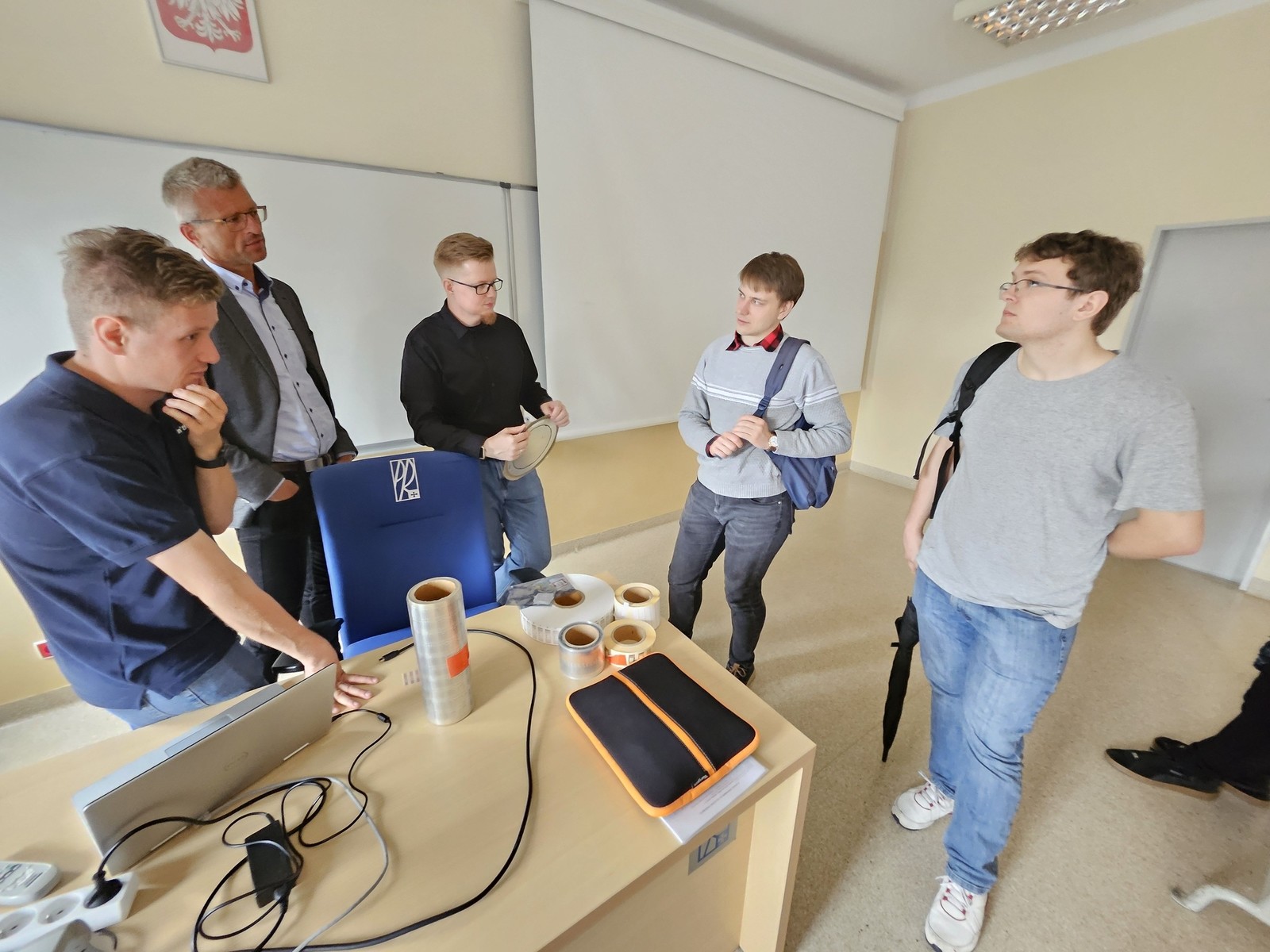 W dniu 4 czerwca 2024 roku studenci ostatniego semestru studiów II stopnia na kierunku elektronika i telekomunikacja, w ramach kończących się zajęć z modułu pn. technika radiowej identyfikacji obiektów, mieli okazję do spotkania się z przedstawicielami Talkin Things SA, które zostało zorganizowane z inicjatywy dra hab. inż. Piotra Jankowskiego-Mihułowicza, prof. PRz w ramach Politechnicznej Sieci VIA CARPATIA im. Prezydenta RP Lecha Kaczyńskiego. Spółkę reprezentowali: Paweł Tomczak (CEO, Vice-President of the Management Board), Wojciech Lichoń (R&D Director) oraz Mateusz Chamera (Lead of RFID Tag Development). W trakcie spotkania odbył się wykład, podczas którego mgr inż. Wojciech Lichoń oraz mgr inż. Mateusz Chamera wpierw zaprezentowali studentom Wydziału Elektrotechniki i Informatyki swoje sylwetki zawodowe, a następnie przedstawili projektowo-produkcyjny profil działalności firmy w zakresie techniki RFID. Podczas prezentacji omawiane były konkretne przykłady projektowania, prototypowania i produkcji w Talkin Things identyfikatorów RFID, które znajdują powszechne zastosowania w zautomatyzowanych procesach takich firm, jak np.: Decathlon, Inditex, Boehringer Ingelheim, Sato, Nestle, Calzedonia, L'Oréal, Sanofi, Mango, Goodwill, Mars, Coca-Cola, GSK, P&G, TAKARA-TOMY Company. Prezentacja była wzbogacona pokazami półfabrykatów projektowanych anten, wafli krzemowych z chipami wykorzystywanymi w procesie produkcji, a także finalnych rozwiązań konstrukcyjnych identyfikatorów RFID. Było to doskonałe uzupełnienie wiedzy, jaką studenci zdobywali podczas zajęć dydaktycznych realizowanych w przedmiotowym zakresie.