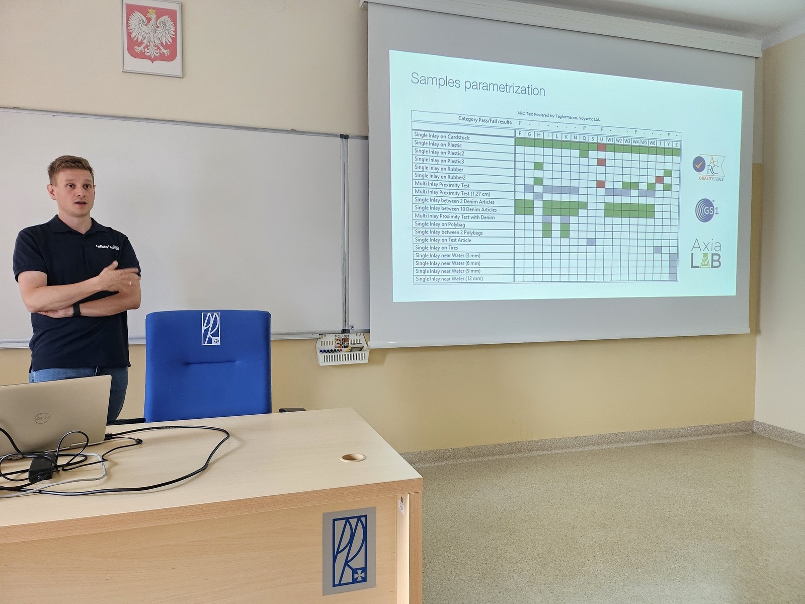 Na podkreślenie zasługuje fakt, że obecni przedstawiciele firmy Talkin Things (mgr inż. Wojciech Lichoń oraz mgr inż. Mateusz Chamera) są absolwentami tego samego kierunku studiów, co zebrani słuchacze wykładu, a swoje pierwsze doświadczenia zawodowe zdobywali w zaawansowanych projektach B+R+W realizowanych dla partnerów przemysłowych w ZSEiT. Można więc powiedzieć, że kluczowy potencjał badawczo-rozwojowy firmy Talkin Things został zbudowany na zasobach ludzkich wykształconych przede wszystkim w zespole techniki RFID w ZSEiT PRz. Zaplecze to wpierw było rozwijane w pomieszczeniach budynku A na WEiI, a aktualnie funkcjonuje w Głogowie Małopolskim (Talkin Things R&D Hub). W chwili obecnej spółka posiada w Warszawie linie produkcyjne, na których wytwarza znaczniki RFID autorsko opracowane w Talkin Things R&D Hub. Znaczące jest więc to, że na podstawie potencjału intelektualnego, który został wytworzony w zakresie techniki RFID w ZSEiT PRz, można budować tak innowacyjne przedsięwzięcia w gospodarce na Podkarpaciu, co w miły sposób zostało zasygnalizowane gromkimi brawami, jakimi studenci WEiI podziękowali przybyłym przedstawicielom firmy Talkin Things.