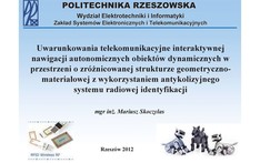 - Mariusz Skoczylas, Uwarunkowania telekomunikacyjne interaktywnej nawigacji autonomicznych obiektów dynamicznych w przestrzeni o zróżnicowanej strukturze geometryczno-materiałowej z wykorzystaniem antykolizyjnego systemu radiowej identyfikacji