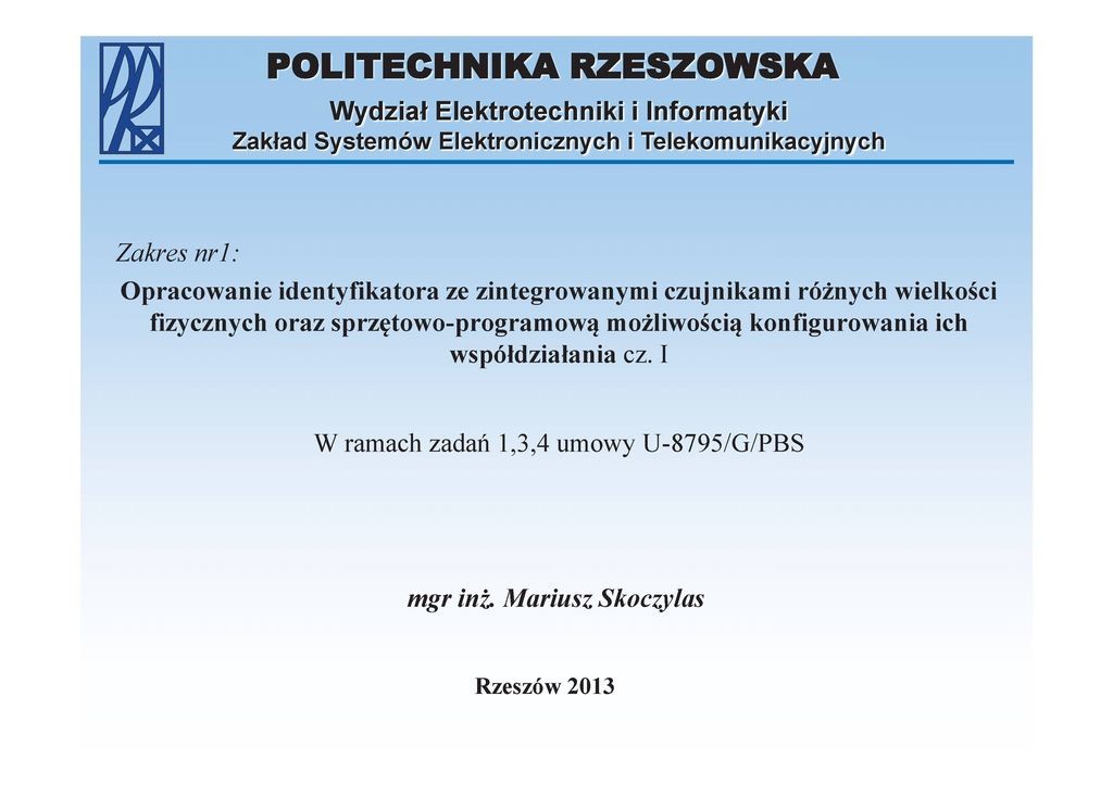 - 2013-10-01 – Mariusz Skoczylas, Identyfikator ze zintegrowanymi czujnikami różnych wielkości fizycznych oraz sprzętowo-programową możliwością konfigurowania ich współdziałania, cz.II