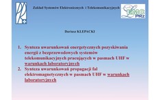 - 2013-07-25 – Klepacki Dariusz, Synteza uwarunkowań energetycznych pozyskiwania energii z bezprzewodowych systemów telekomunikacyjnych pracujących w pasmach UHF warunkach laboratoryjnych; Synteza uwarunkowań propagacji fal elektromagnetycznych w pasmach UHF w warunkach laboratoryjnych